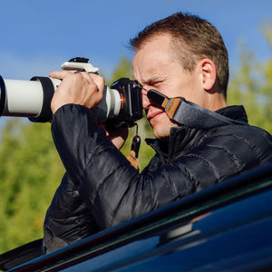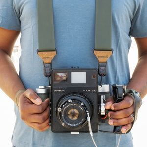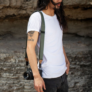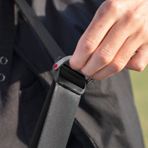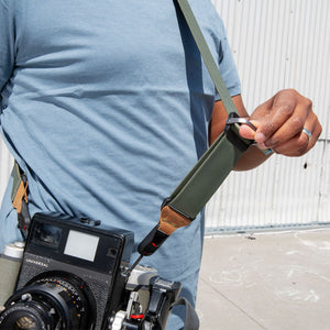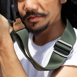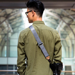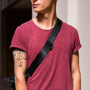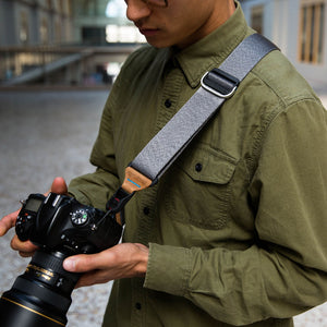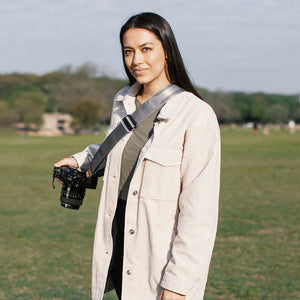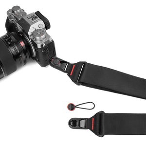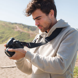 Fabricada con una correa de nylon acolchada y de doble textura, ofrece un lado suave que se desliza sobre la ropa y otro con grip antideslizante para máxima estabilidad. Su sistema de ajuste dinámico te permite cambiar rápidamente la longitud con una sola mano, ideal para moverte entre tomas sin perder tiempo.