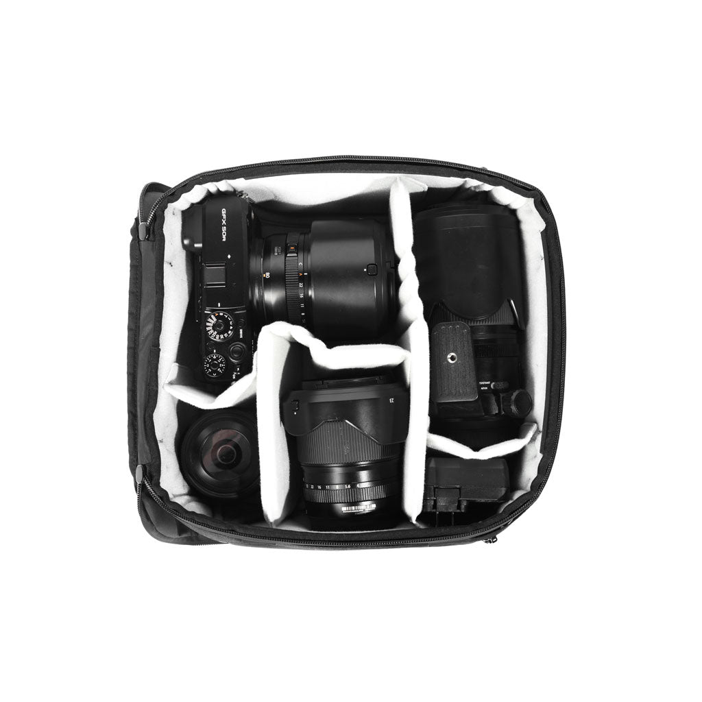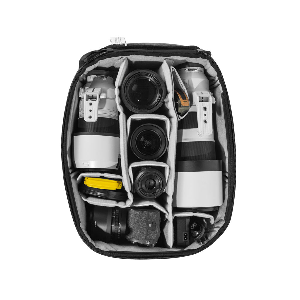 Los divisores FlexFold™ de bajo perfil permiten una organización totalmente ajustable, brindando una alta protección y flexibilidad para adaptarse a distintas necesidades. La apertura principal ampliada garantiza visibilidad total del contenido y acceso eficiente al equipo, con la opción de retirar el acolchado para facilitar el acceso cuando los cubos están dentro de un bolso de viaje.