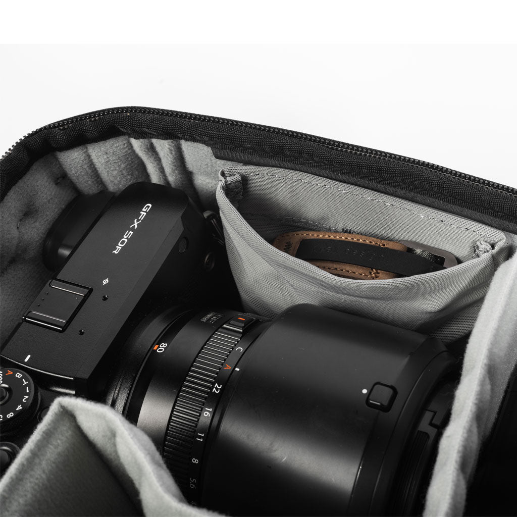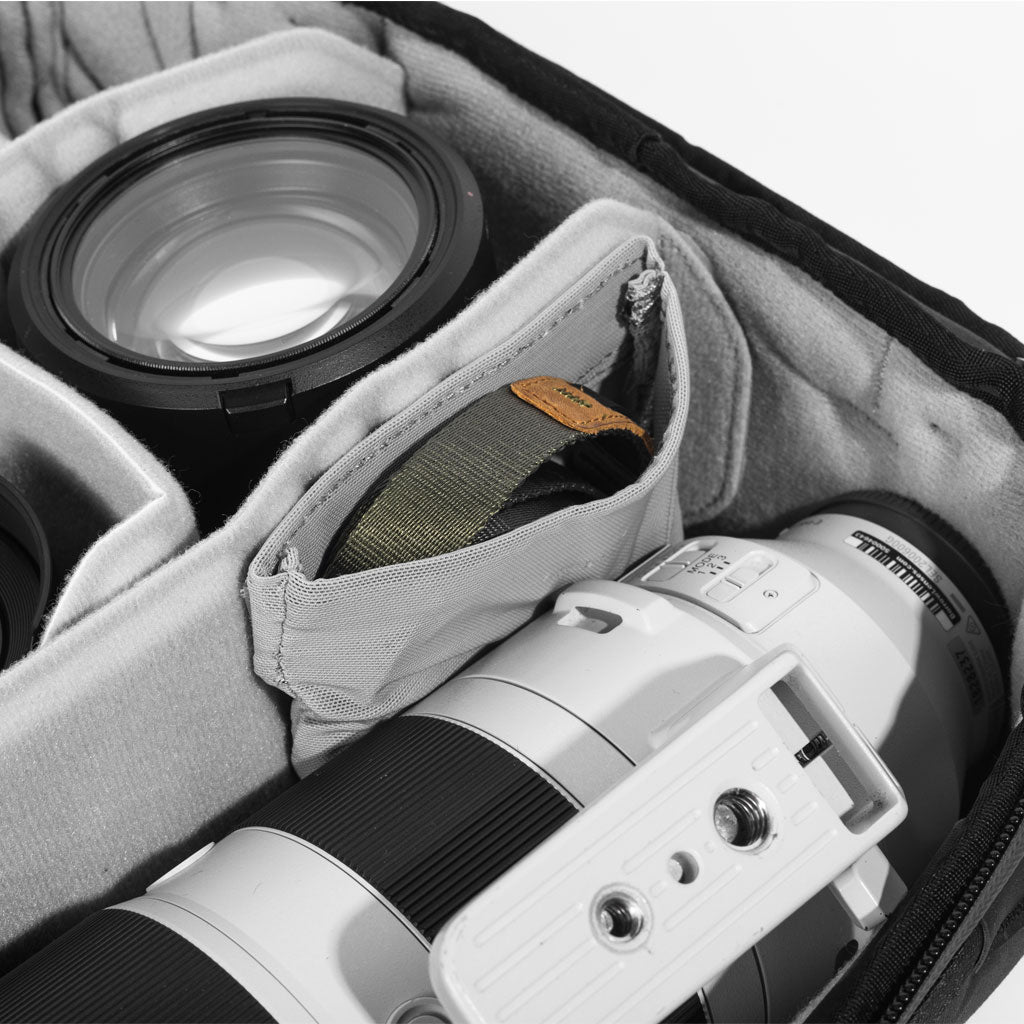 Los cubos de tamaño Mediano y Grande cuentan con cremalleras laterales dobles que permiten acceder al equipo desde los puntos de acceso laterales de la Mochila de Viaje 45L (se vende por separado). Además, los modelos Smedium, Mediano y Grande incluyen un bolsillo flotante diseñado para almacenar filtros, tapas de lentes y otros artículos pequeños.