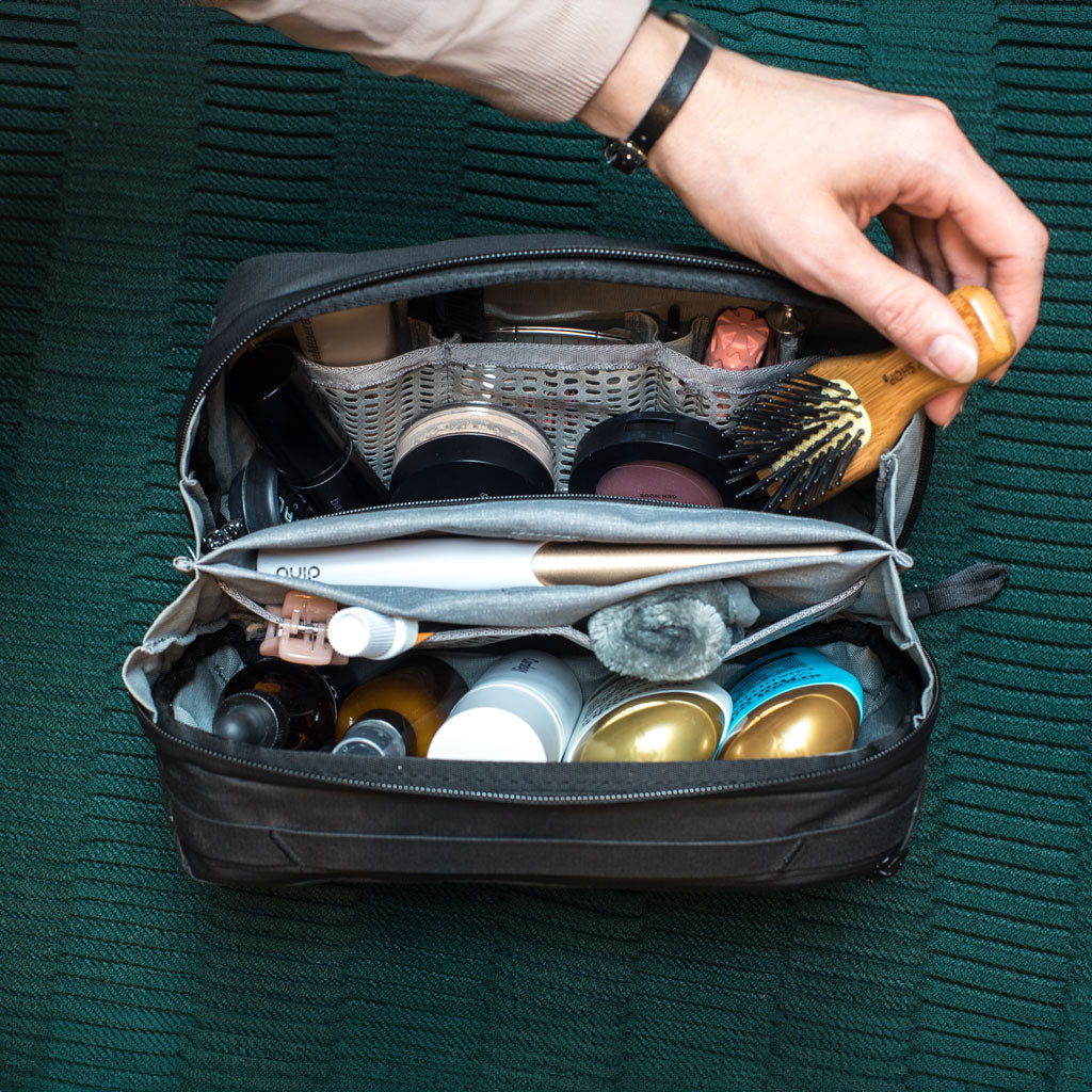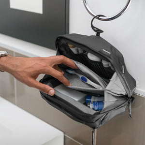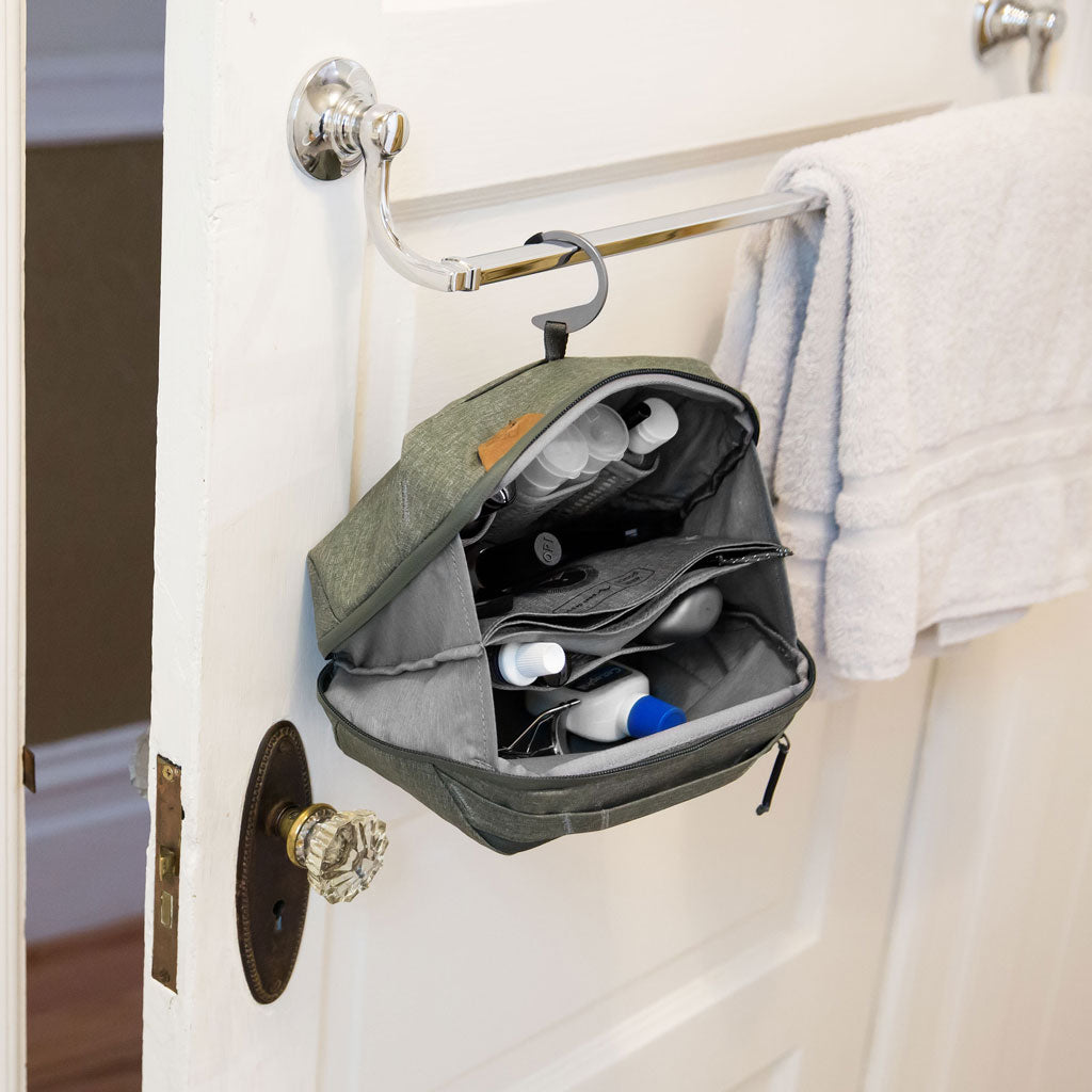 El estuche puede mantenerse erguido sobre una superficie o colgarse mediante un gancho de aluminio que se guarda fácilmente. En su interior, una red de bolsillos de malla de nilón recubiertos de TPU, un bolsillo con cremallera y un bolsillo magnético para cepillos de dientes mantienen tus artículos organizados y limpios. Todos los bolsillos se pueden voltear hacia afuera para una limpieza profunda en caso de derrames. En el exterior, un bolsillo adicional con cremallera proporciona espacio para una afeitadora simple u otro artículo pequeño.