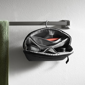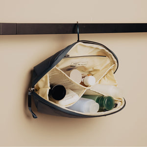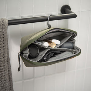 El estuche puede mantenerse erguido sobre una superficie o colgarse mediante un gancho de aluminio que se guarda fácilmente. En su interior, una red de bolsillos de malla de nilón recubiertos de TPU, un bolsillo con cremallera y un bolsillo magnético para cepillos de dientes mantienen tus artículos organizados y limpios. Todos los bolsillos se pueden voltear hacia afuera para una limpieza profunda en caso de derrames. En el exterior, un bolsillo adicional con cremallera proporciona espacio para una afeitadora simple u otro artículo pequeño.