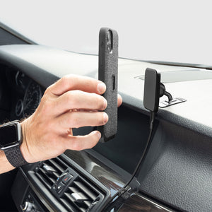 A diferencia de los soportes de plástico voluminosos, este soporte está construido en aluminio anodizado de alta calidad y se adhiere firmemente al tablero o consola a través de una resistente almohadilla adhesiva 3M VHB. Su sistema de montaje SlimLink™, compatible con MagSafe, utiliza imanes ultra fuertes que mantienen tu teléfono fijo incluso en caminos dificiles, mientras que el cabezal de bola ajustable en aluminio permite personalizar el ángulo de visión sin obstruir la vista de la carretera.